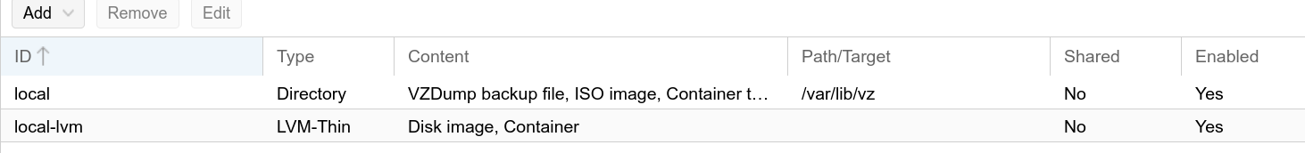 **local**: es de tipo directorio y nos permite almacenar, archivos de backups, imágenes ISO y plantillas de contenedores.