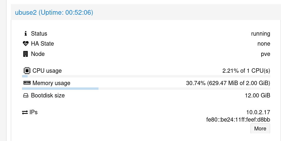 <figure><img src="https://2817582392-files.gitbook.io/~/files/v0/b/gitbook-x-prod.appspot.com/o/spaces%2FvGN1WZpuVtUpSb3xgLvp%2Fuploads%2FOT39tblbdek45FWrh3FK%2Fimage.png?alt=media&#x26;token=299748fc-f05f-4c0c-8b99-4be3b906f513" alt="" width="563"><figcaption><p>Información de una VM en el dashboard de Proxmox</p></figcaption></figure>