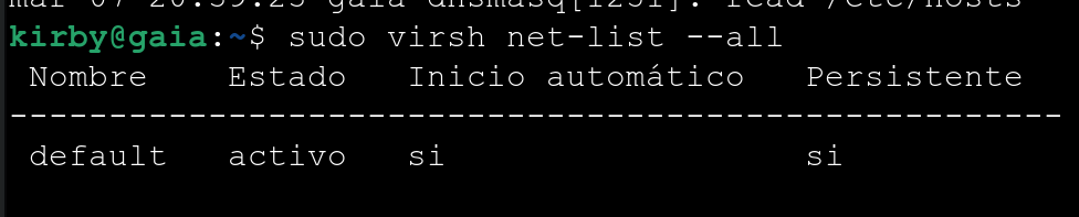 Con virsh listamos las redes que tenemos activas o no:
